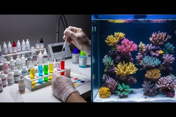 Kits colorimétricos (Red Sea, Salifert, Hanna) são padrão. O processo geralmente envolve adicionar reagentes que mudam cor conforme reagem com cálcio, depois comparar com cartela ou contar gotas até mudança de cor.