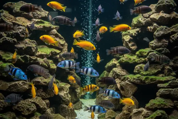 Aeração: Essencial. Pedras porosas ou difusores para manter oxigênio dissolvido elevado (6-8 mg/L). O Tanganyika é bem oxigenado naturalmente.