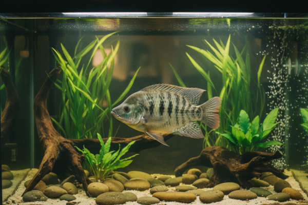 Tamanho do Aquário: Para garantir o bem-estar do Ciclídeo do Nilo (Tilapia nilotica), é necessário oferecer um aquário de tamanho adequado. Considerando que a espécie pode crescer consideravelmente, o mínimo recomendado para um aquário solo é de 200 litros. Esse tamanho proporciona espaço suficiente para o peixe nadar livremente e se desenvolver de forma saudável. No caso de manter mais de um exemplar ou criar um pequeno grupo, recomenda-se aumentar o volume do aquário, considerando 100 litros adicionais para cada peixe extra.